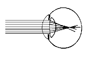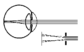 crystalline lens are refracted differently and are not focused at a single point. The extreme outer rays are refracted more strongly than the central ones (Figure A2-2). As a result of spherical aberration, a beam of parallel rays entering the eye is focused on the retina not in the form of a sharp image, but in the form of a circle of light diffusion. The size of the circle of light diffusion resulting from spherical aberration is in direct proportion to the size of the pupillary opening. It is obvious that the sharpness of the image is increased if one eliminates extreme rays. Consequently, as the pupillary opening contracts, the sharpness of the image of the object upon the retina increases.